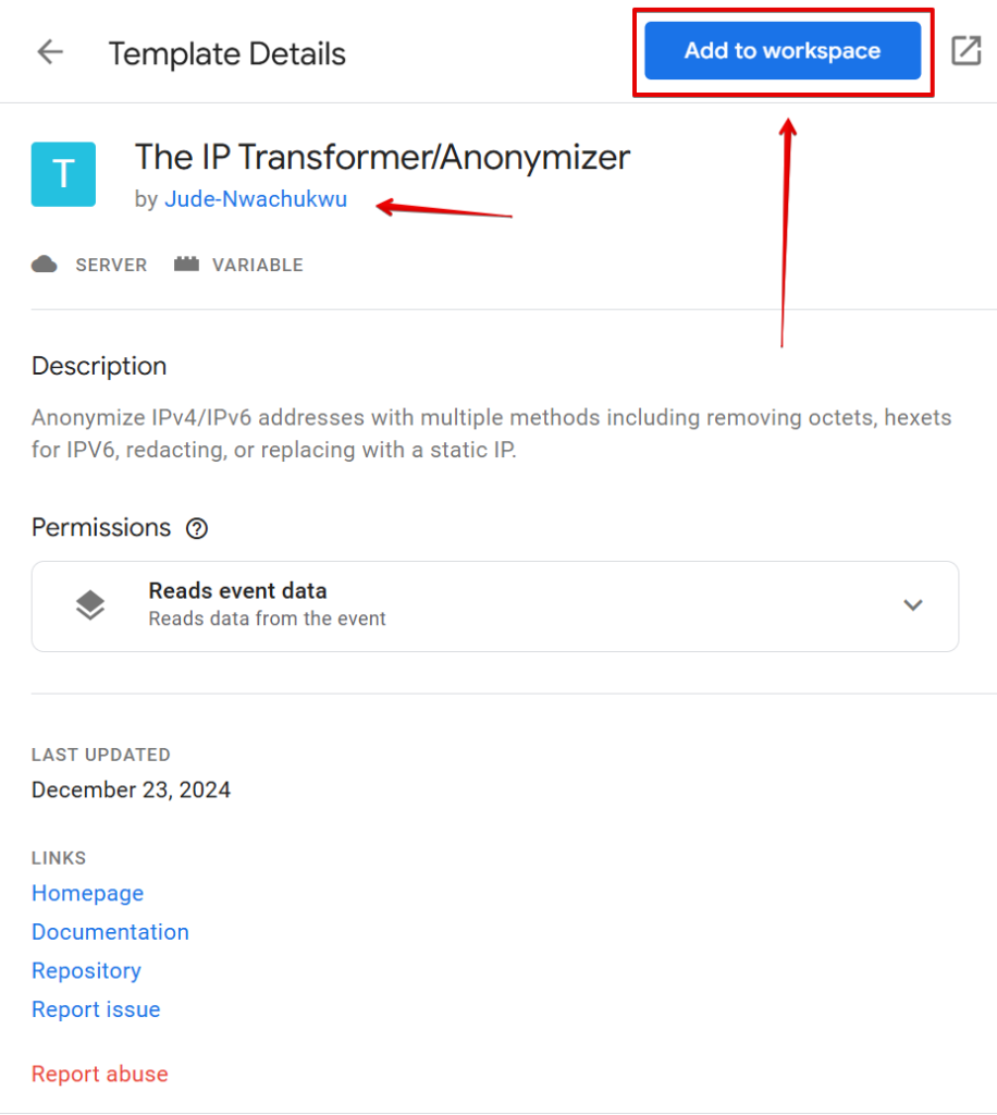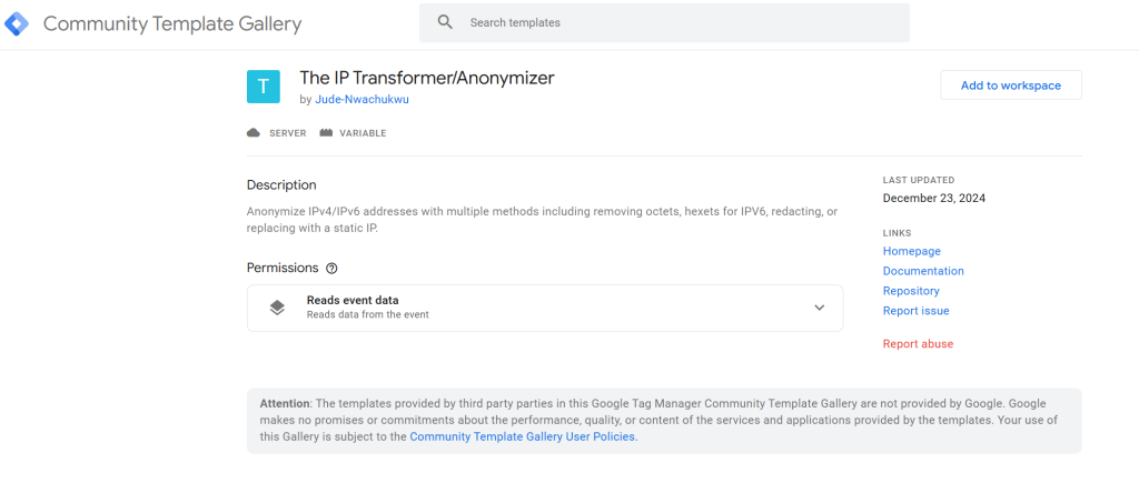 - Find the Template: Navigate to the Google Tag Manager community gallery and add the “IP Transformer/Anonymizer” template to your sGTM container.