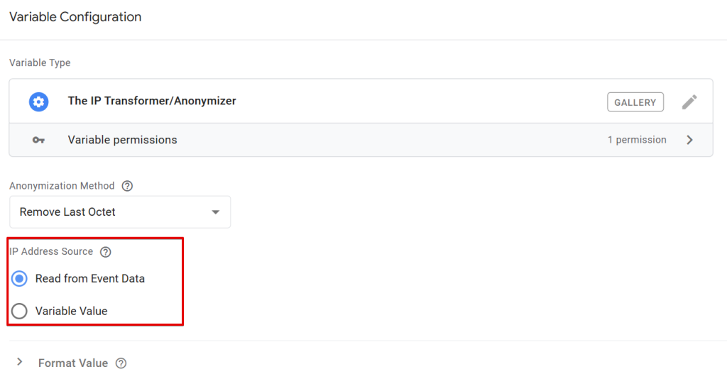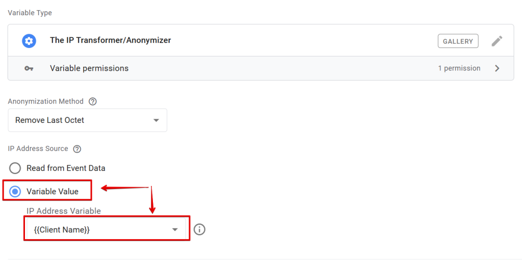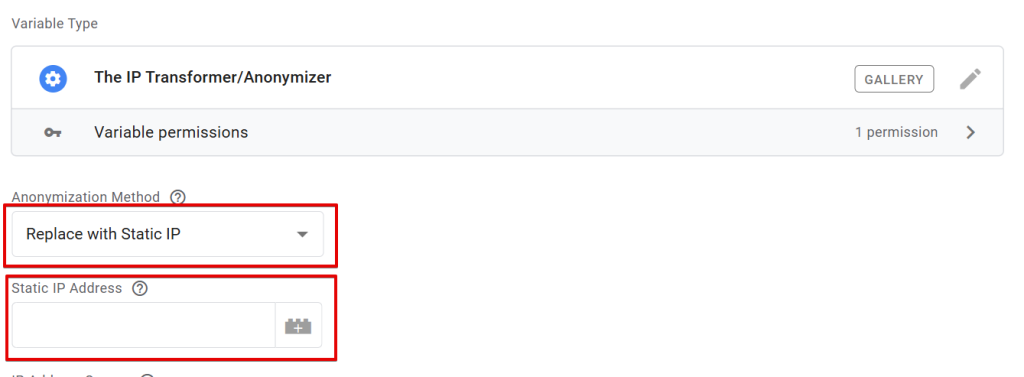 This allows you to choose the sGTM container variable that holds the IP address you want to anonymize with the “IP Transformer/Anonymizer” variable.